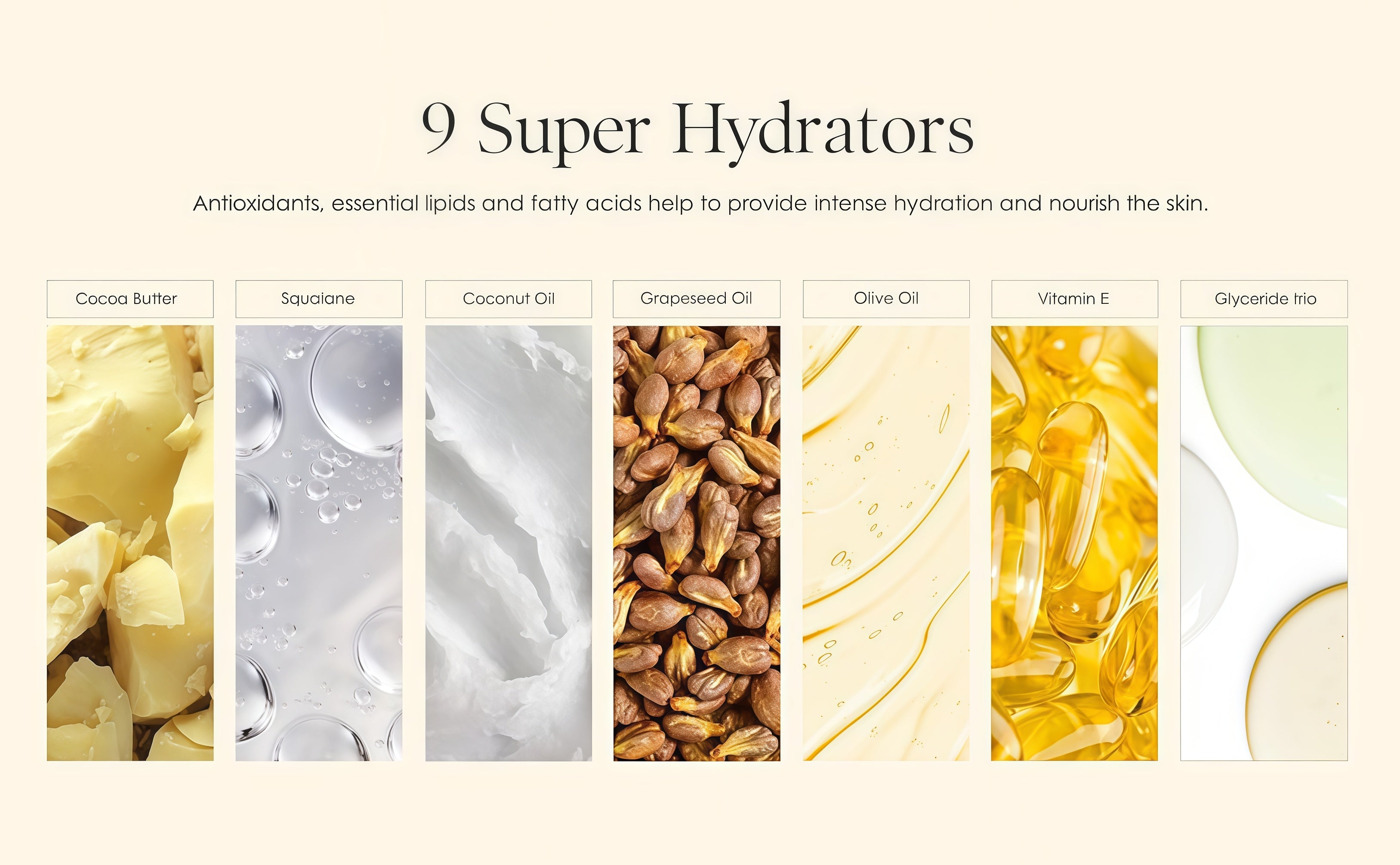 12 Super Hydrators An ultra-hydrating blend of antioxidants, essential lipids and fatty acids that locks in hydration for up to 72 hours and helps support the skin's moisture barrier.